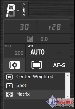 这就是进入拍摄/回放菜单后的屏幕显示(实际本图是‘拍摄’界面,回放界面与通常图片浏览界面雷同)。很明显,在这个界 面上我们可以对相机的曝光方式、测光方式、对焦方式、画质等选项进行细致调节,一如我们在机身上做的那样。画面右上角还有一个类似机身肩屏的LCD显示区域用来展现机身状态。
