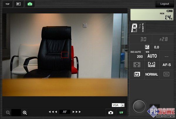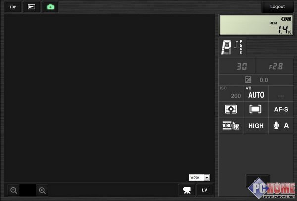 画面中那个巨大的空白部分实际就是取景窗口,我们可以按下画面下方的LV字样启动相机liveview功能打开实时取 景。很快,电脑屏幕上就显示出了镜头所拍摄到的实时取景画面在照片拍摄状态下,画面右下角那个大圆球就是快门按键。由此,如果是拍摄那些固定取景角度的画 面,用户只需将相机固定在脚架上,然后人在电脑上就能控制相机拍摄并立即得到照片进行编辑处理,相当方便。