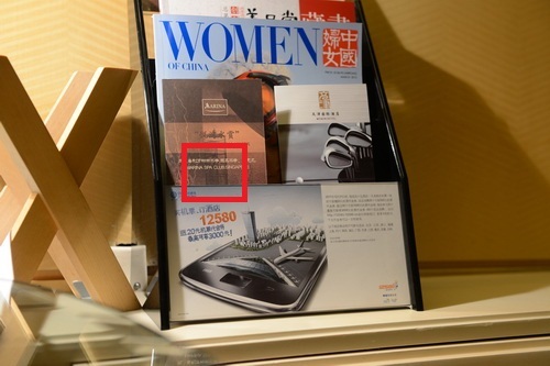 首先是在室内较好光照环境中,对客房内的杂志架简单拍摄了几张。所有设置都基本为默认(JPEG压缩从标准提升为精细),对比图为红圈中框出的部分。