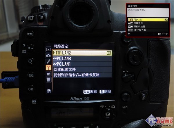 在尼康D4机身设定菜单中,有独立的网络选项。用户可以先选择连接方式(无线/有线),然后可以选定自己想要使用的服务功能。对于真正的摄影记者而言,通常 会选择默认的FTP上传模式直接将图片高速传输到编辑部门的图片库FTP内供文字记者选用,不过我今天首先选择的是最简单的D4-PC图像传送。
