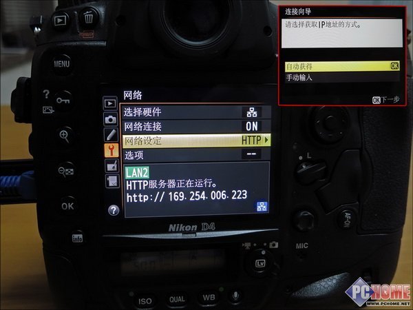 尼 康D4自带一个网络连接的向导,它会一步步的教用户如何把相机与电脑连接起来,一般只要按照提示操作即可。用户也可以对各种连接配对方式重新命名或者自己 选择是自动分派IP还是手动设定。相信只要有一点网络基础的用户都能轻松搞定。在连接过程中,相机提示要在打开Wireless Transmitter Utility后再用USB线连接一次电脑和D4用以配对,这个过程很快,只要短短几秒就可以配对成功,不过分配IP的时间略长,首次大约需要等待 20-30秒。