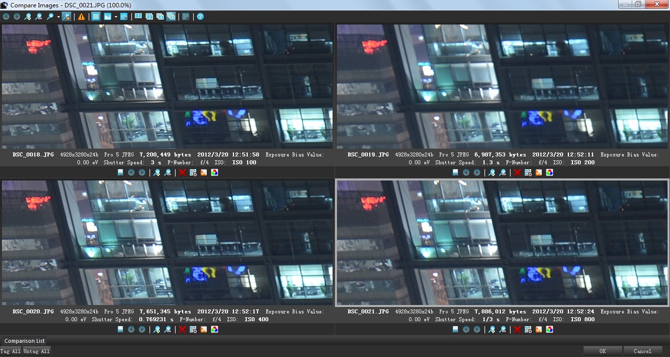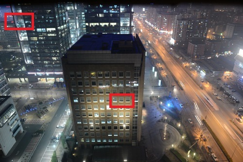 以下是对窗外夜景照片的拍摄,整体光照情况要比室内弱一些且画面中又较暗的物体(建筑)。对画面中心和边缘部分中等亮度部分进行对比。情况如下: