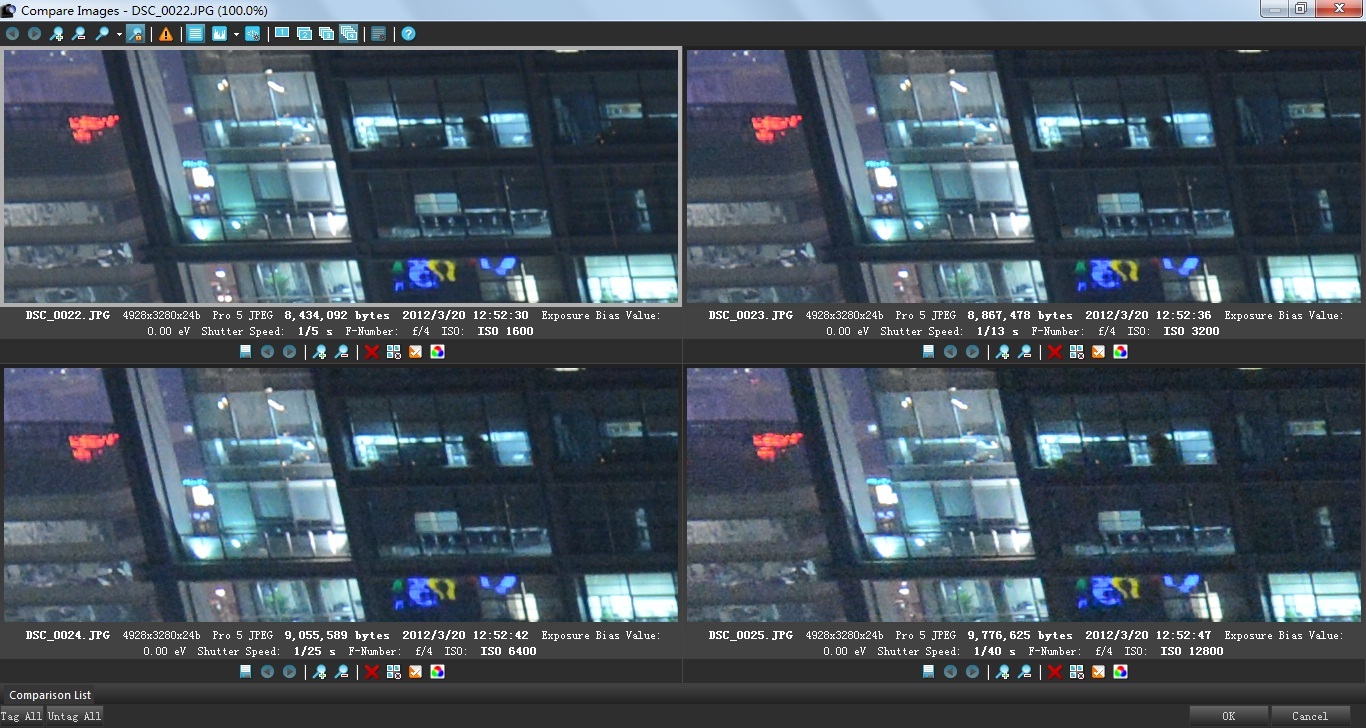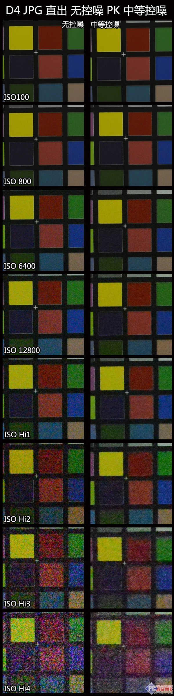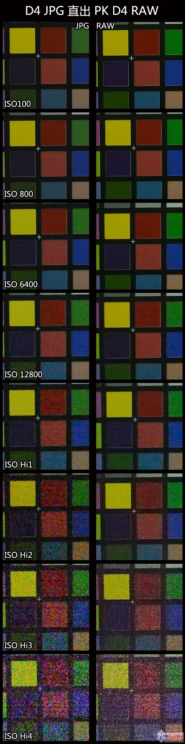 为了更严谨的对D4的高感性能做出客观的测试,这一次使用镜头24-70mm F/2.8在相同的光圈和焦距、固定三脚架,相机采用标准色彩模式、RAW采用14Bit无损压缩设置、JPG使用最大的最佳画质设置,固定使用相同色 温、关闭动态D-Lighting、关闭长时间曝光降噪,高ISO降噪分关闭和普通进行两组测试。并分别对比了JPG无控噪直出和打开中等级别控噪、D4 自身JPG直出和RAW转换后的各级别ISO对比。