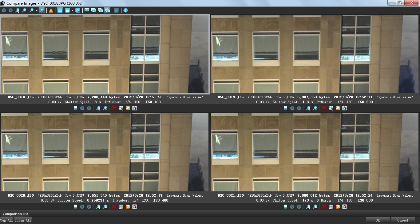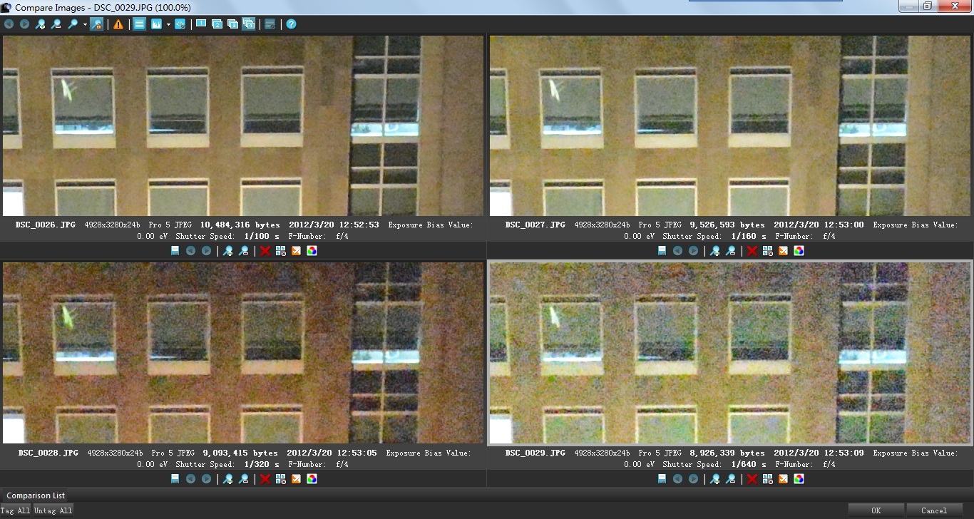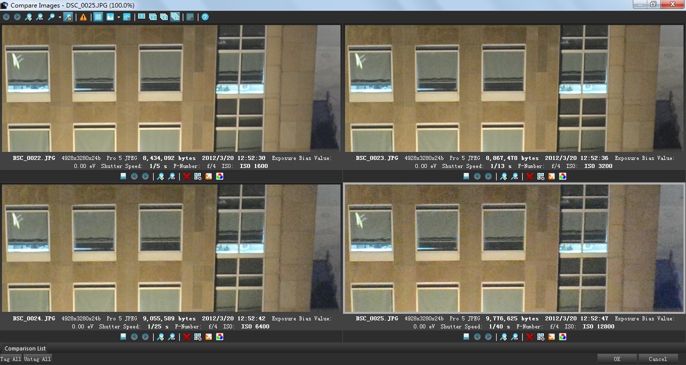 为了更严谨的对D4的高感性能做出客观的测试,这一次使用镜头24-70mm F/2.8在相同的光圈和焦距、固定三脚架,相机采用标准色彩模式、RAW采用14Bit无损压缩设置、JPG使用最大的最佳画质设置,固定使用相同色 温、关闭动态D-Lighting、关闭长时间曝光降噪,高ISO降噪分关闭和普通进行两组测试。并分别对比了JPG无控噪直出和打开中等级别控噪、D4 自身JPG直出和RAW转换后的各级别ISO对比。