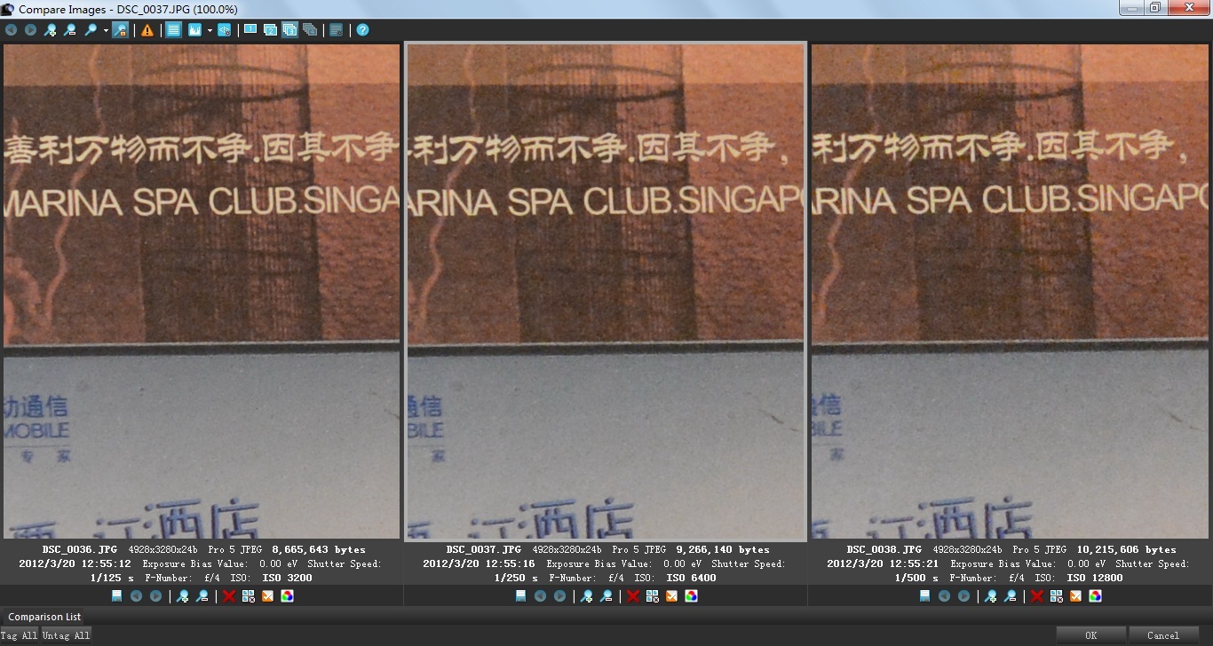 和预想的差不多,三张照片差异不大,仅仅在ISO 1600黑色部分有极其轻微的一点点若有若无的蓝黄伪色信号;