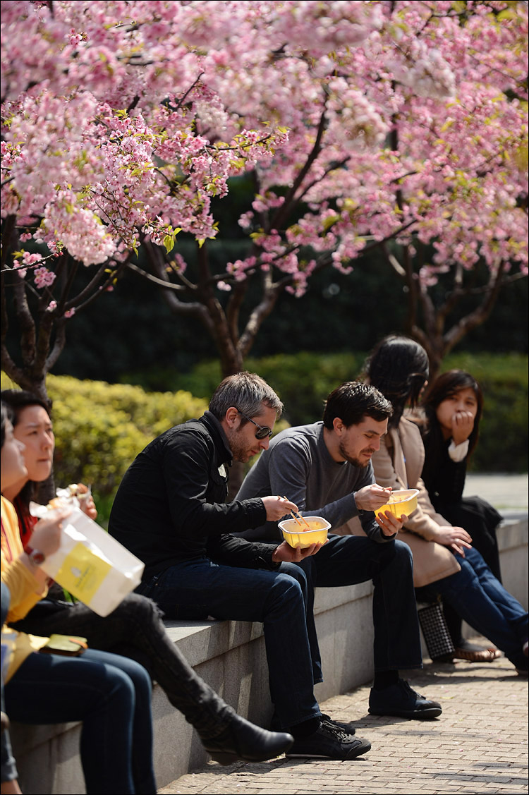 尽管今天依然是工作日,但在静安公园里赏花的人依然不少,老中青三代外加各类小正太小萝莉一应俱全。和我们一样端着长枪短炮拍花打鸟的朋友也真不少,可以想象如果今天是休息日的话这里恐怕已经人满为患了。