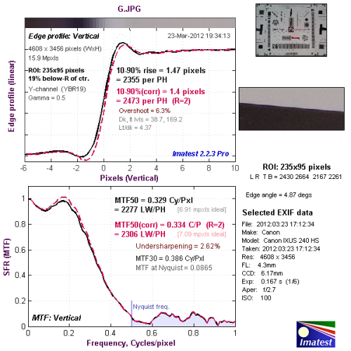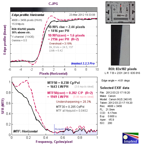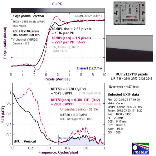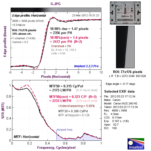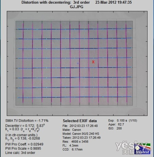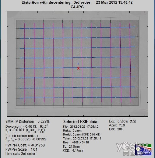 我们使用Imatest对佳能IXUS 240 HS的分辨率与色散情况进行了测试,大家可以将测试所得的分辨率结果与上图标准进行比对,从而获得直观而明确的参考。