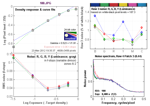 从左下方的RMS图看出,佳能IXUS 240 HS在ISO100时最高躁点值接近0.12。左上方的Row 3 noise:R,G,B,Y(Luminance)图表中,蓝色上蓝色通道的噪点较多为1.3左右,绿色上红、蓝色通道的噪点数值相当,在0.9左右,红色上也是蓝色通道噪点数最多,为0.9左右。从以上数据看出,佳能IXUS 240HS降噪功能还是很不错的。