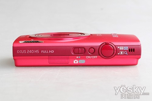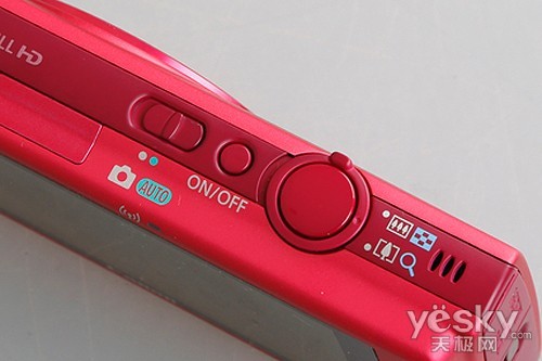 佳能IXUS 240 HS机身顶部按键为电源开关、快门、焦距调节键和智能程序拍摄模式切换键