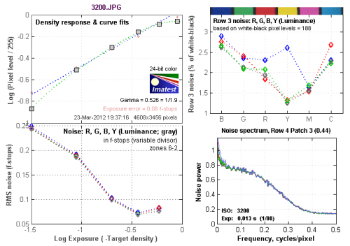 在佳能IXUS 240 HS的ISO3200感光度测试中,左下方RMS图表中表示,最高噪点值在0.25左右。右上方的Row 3 noise:R,G,B,Y(Luminance)图表中,蓝色上蓝色通道噪点数值为2.9左右,绿色上红、蓝色通道噪点相当在2.5左右,而红色上蓝色通道的噪点最多为2.3左右。在高感光度ISO3200的情况下,佳能IXUS 240 HS表现出了不错的降噪能力。