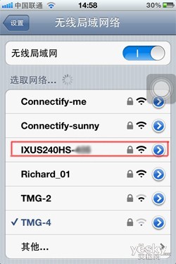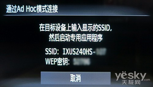 此时会弹出佳能IXUS 240 HS的SSID和WEP密匙,保留此界面不退出,凭此连接iPhone的无线设备。