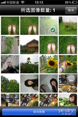 跳转成此界面时,即表示佳能IXUS 240 HS已经与iPhone连接成功。选择右下角的发送此图像即可直接将此图像发送至手机,而选择左下角的“选择并发送”,则可选择多种照片后再发送。