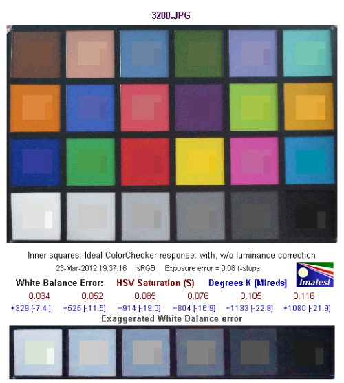 依照惯例,我们使用24色标准色板作为测试的基准平台,并使用Imatest软件进行数据的量化分析,对佳能IXUS 240 HS的色彩表现了进行检测。