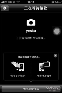 再看看iPhone的界面,在我们操作相机时,会显示正在等待,并可选择“等待接收”和“相机查看”两种模式。选择“等待接收”后,方可待相机传输后直接查看图像。