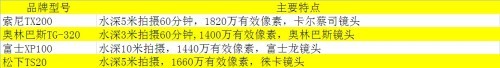 索尼TX200V、奥林巴斯TG320、富士XP100、松下TS20