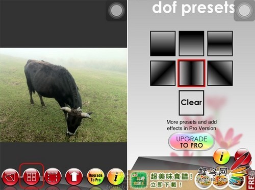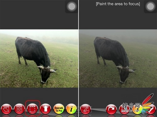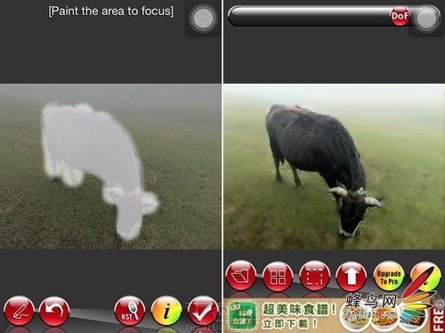 选择完成照片后便进入了iQuikDof的编辑区域。在iQuikDof中,有两种编辑模式:第一种模式直接在软件设定好的6种方式中选择一种方式形成景深效果;另一种方式通过选择照片中的拍摄主体,通过设置将背景变为模糊,制作景深效果。
