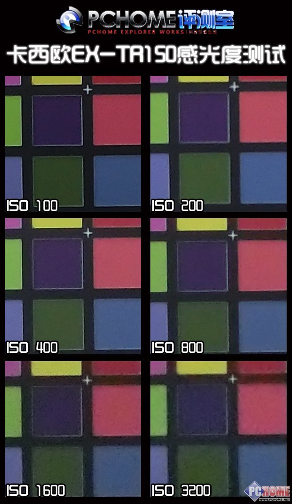 于是小编不得不在固定住卡西欧TR150相机、固定使用荧光灯色温模式的情况下对每一级的感光度逐一拍摄并对画面最中心做100%的截图。