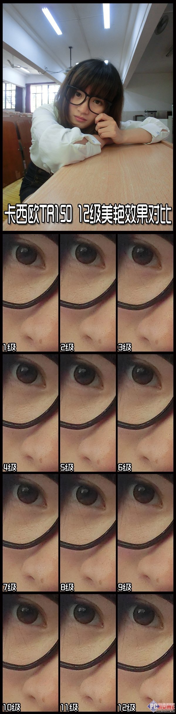 下图是在室内逆光源的环境中拍摄,这样的环境对于卡西欧的美颜功能来说是一个极大的考验。就让我们近距离的来看看美颜功能到底对MM的皮肤做过些什么样的处理。我们可以看到当美颜功能设置在最低级别的时候,由于逆光室内光源的场合MM脸部的曝光略微欠暴一点。当级别设置到2和3之后我们可以发现曝光每一级都呈阶梯状的增加。1-6级几乎都是按照这样一个情况变化着,但是6级之后我们会发现在曝光依旧不断的增加的同时MM皮肤的细节开始减少。当然减少细节意味着皮肤的瑕疵也同样的减少,以至达到最终的美颜效果。