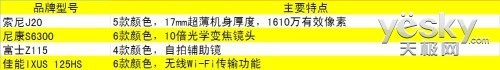这次将介绍以下几款数码卡片相机:索尼J20(资料 报价 图片 论坛)、尼康S6300(资料 报价 图片 论坛)、富士Z110、佳能IXUS 125HS和奥林巴斯VH-210。这些机器上市时间都不算长,却拥有不错的销量,它们的外观都是非常绚丽多彩的,内在性能也有各自特色。下面就为您从外观到性能详细介绍这几款机器。