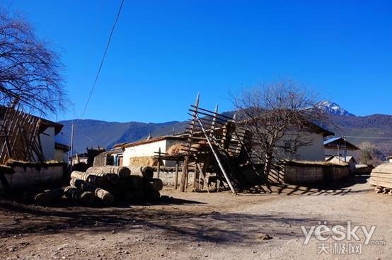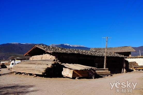 村口堆着一些圆木,稀疏的长着几颗枯树,与雪山小镇的景色又有所不同,只有背后蔚蓝的天、连绵的山在告诉你,这是西藏,也多谢X100能够让我如此还原当时的色彩。