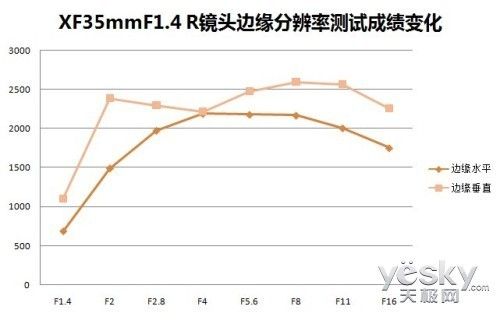 从富士XF 35mm F1.4 R镜头的分辨率情况来看,中心部分的分辨率确实令人满意,分辨率数值也基本在2500线以上。而从边缘分辨率来看,F8则是最佳光圈。而从总的分辨率情况来看,在光圈F5.6-F8的情况下富士XF 35mm F1.4 R镜头可以发挥出它的最佳水平。
