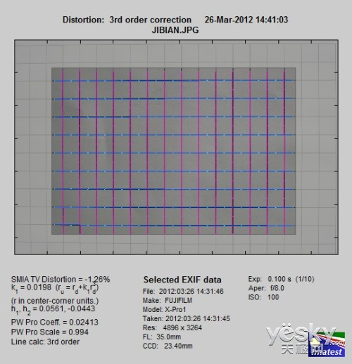 富士X-Pro 1配备了一枚APS-C画幅的图像传感器,富士XF 35mm F1.4 R镜头在乘以1.5倍的转换倍率之后,实际的拍摄焦距为53mm,也算是在广角的范围之内。那镜头的畸变情况就对这支镜头的素质起着至关重要的作用。通过畸变测试,我们看到这支镜头的桶形畸变值仅为-1.26%,可以说是控制的相当完美。