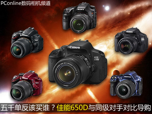 佳能650D(资料 报价 图片 论坛)在发布之后迅速上市,其态势甚有赶占市场的感觉,其定价也遵循以往的规律,跟旧款600D刚上市时差不多。而在四、五千元的单反市场当中可选择的型号也相当多,对于整体性能提升明显的650D来说,是现在就入手?还是可以选择其他品牌型号?这里为您一一对比。对比机型有:佳能600D(资料 报价 图片 论坛)/佳能550D(资料 报价 图片 论坛)、索尼α57(资料 报价 图片 论坛)、尼康D3200(资料 报价 图片 论坛)/尼康D5100(资料 报价 图片 论坛)、宾得K-30(资料 图片 论坛)。
