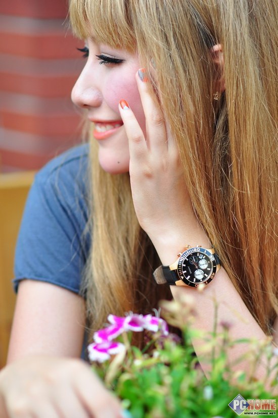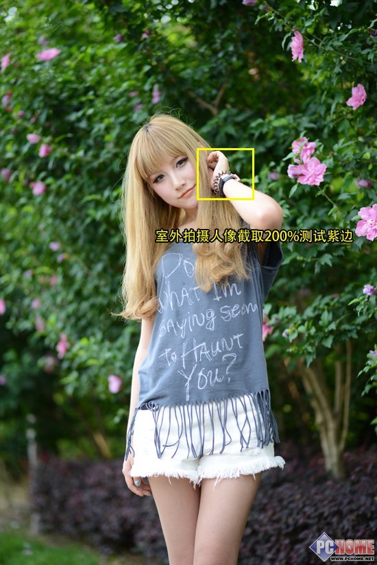 室外自然光人像实拍光圈使用F2.0,将此图200%放大后我们可以看出金属物体手表在直面阳光时无法避免的出现紫边,和上面测试的金属铜像F2.0时情况完全相同。