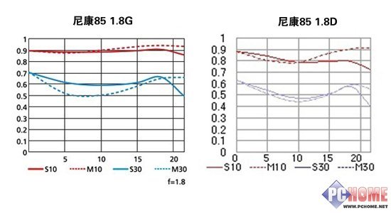 尼康85 1.8G和85 1.8D的MTF曲线图对比