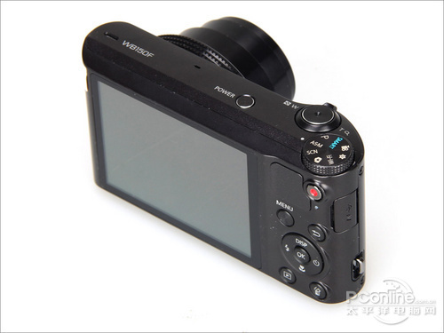 三星WB150F机身设置的按键还是比较多,不过集中程度非常高,就如机顶为例。机身顶部主要是三大键组成,分别是电源开关键、快门/变焦/缩放功能键以及模式转盘。除了电源键是一体键以外,其余两个按键都集合了多种功能;特别是模式转盘,虽然这些在卡片相机当中转盘的模式仅限于多种自动模式,针对专项功能和手动模式的部分并不是主流。随着机身功能的增多,试图把所有功能都集聚至菜单当中就会导致特色功能的不突出,部分功能外移至转盘中可以让用户最快地使用这些功能。