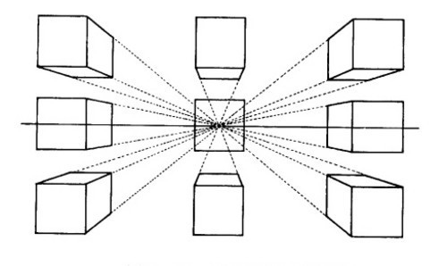 我们从空间透视的类型来分析拍摄的角度。透视的类型有三——单点透视、两点透视、三点透视。我们先从单点透视来分析一下拍摄角度。
