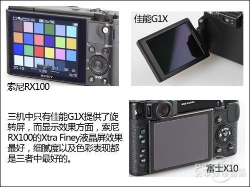 三款产品中,索尼RX100采用Xtra Fine液晶屏,分辨率达到123万,显示效果细腻,且颜色艳丽准确,不过三跨产品中只有佳能G1X配置了旋转屏,牺牲便携性换取的使用便利。