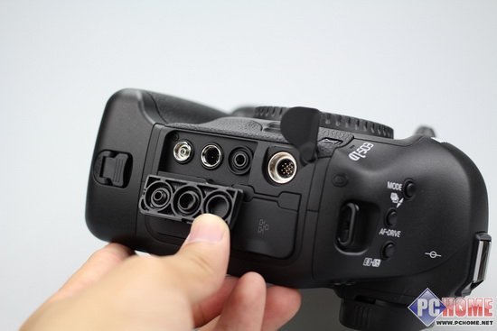 佳能1DX机身侧面的接口,这个接口叫WFT多媒系统体扩展端子,其实就是接WFT无线传输器用的,与1DX搭配的型号是WFT-E6,同时这款传输器也可以用于佳能的摄像机C300,在外型上唯独这一块有一些微微凸起,有些稍不顺手,不如其它三块来的那么贴合,位于它的下方3个口从上到下排序是外接麦克风输入端子、遥控端子(N3型)、PC端子。