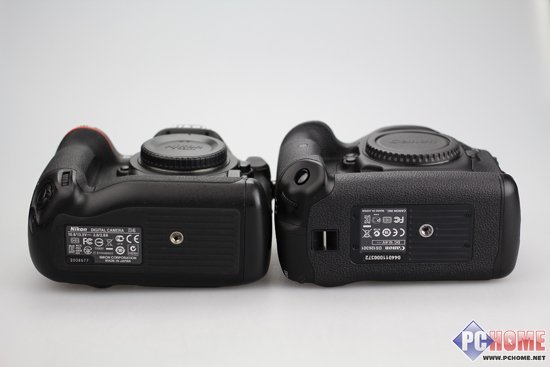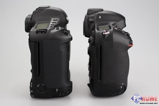 从两台相机的机身右侧看,如果正面不能最直观的看出肥瘦的话,那么从侧面看就清楚很多了,尼康D4的侧面明显要显得更胖了,单从手持相机的感觉来看,尼康D4这样的设计更加贴合手掌与相机直接的密度,而1DX就相对要平滑,但是1DX的快门按键处有着独特的设计,这样的设计让按下快门的感觉更好,机身底部手柄处1DX与上一代产品完全一样,拨盘依然设计在快门按钮之后,而尼康依然设计在快门前面,一个是用食指拨档,一个是用中指拨档,哪个更舒服这就要取决于个人习惯了。