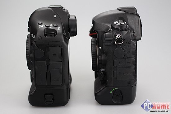从两台相机的机身左侧看,佳能1DX相比尼康D4要显得纤细一些,如今科技信息化时代,两家也紧追时代步伐,都是走着多媒体单反路线,所以机身左侧的小口袋也越来越多了两家都加入了网线和无线接收器插槽及麦克风装置,这些在竞技体育赛事中这些都是起决定性作用的,真是一样都不能少。
