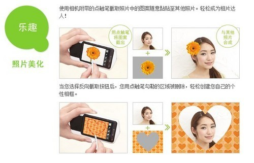 除了12种级别的美肤效果,卡西欧TR150还增加了照片美化功能,可以通过点触笔随意截取照片,再粘贴到你想要的其他照片上,完成乐趣十足的大头照效果。