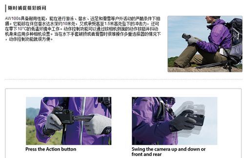 AW100s具备耐用性能,能在进行游泳、潜水、远足和滑雪等户外活动的严酷条件下拍摄。它能够在伴您潜水达水深约10米处,又或承受高至1.5米高处坠下的冲击力,还可在零下10°C的低温环境中工作。动作控制功能可以通过按相机侧面的动作按钮并抖动机身来应用多种相机设置。当在水下手套破损或者滑雪时很难操作多重选择器的情况下,动作控制功能就很方便。
