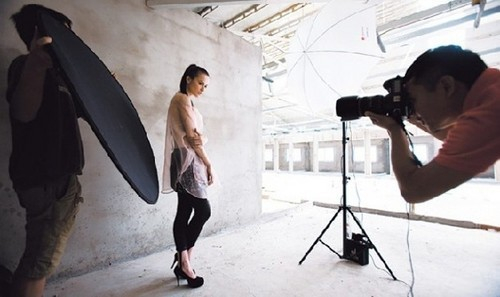 拍摄中,摄影师将单灯放置于模特的左侧,灯头高于模特头部,朝向模特向下打亮;之后摄影师将吸光板安排在与灯光同一直线的模特右前方位置上,这样吸光板就吸收了灯光打向墙壁之后的反射光线;你会看到此时画面中的模特右侧身体轮廓出现了明显的阴影,增大了画面的反差。