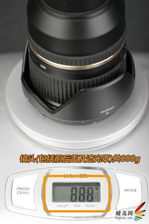 镜头用料扎实,放在手中沉甸甸的,我们测试了一下,其重量为888g,比官方数据上的528g还要稍重一些。