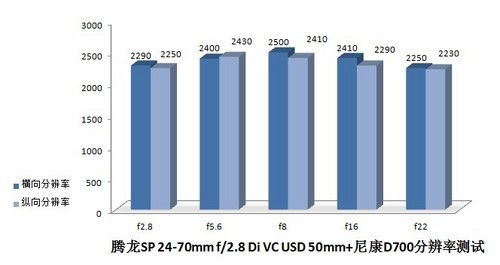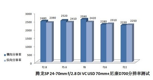 可以看到腾龙SP 24-70mm f/2.8 Di VC USD在各焦段最大光圈F2.8的分辨率还算不错,之后一路小幅上升,F8基本到达最优,F8之后随着光圈缩小逐步小幅下滑。