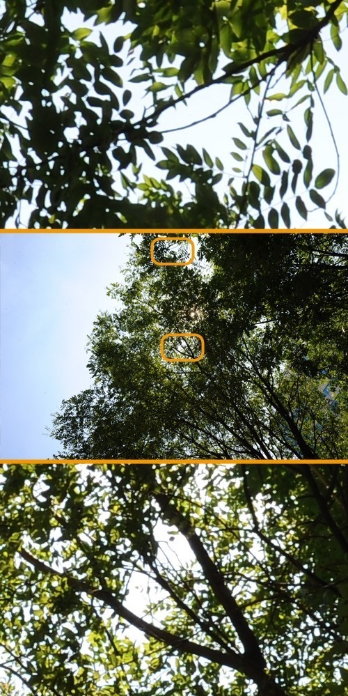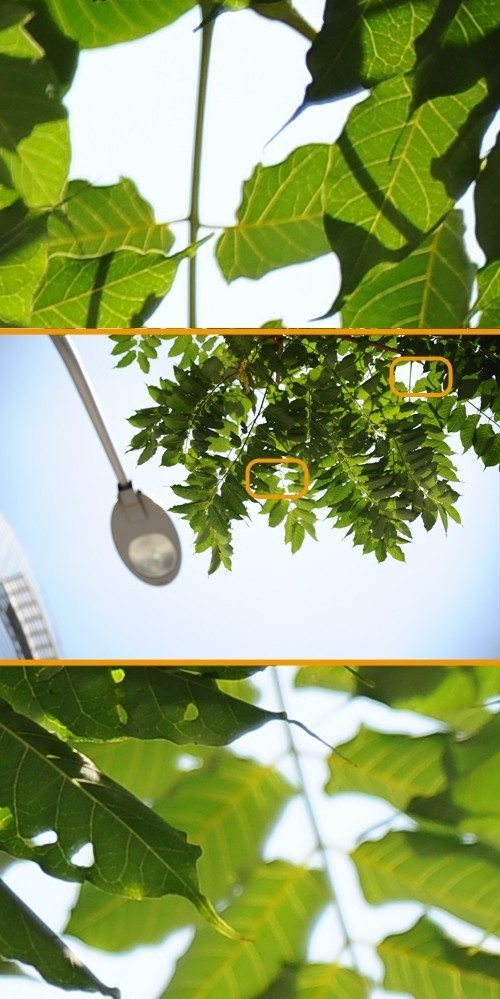 我们选择了光比较大的场景进行了测试,为了避免个性,我们分别用不同的参数拍摄了两个场景,并分别放大中心和边缘细节进行观察。