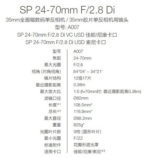 腾龙SP 24-70mm f/2.8 Di VC USD官方型号为A007,A007有尼康、佳能、索尼三种卡口,本次我们评测的镜头为尼康口。