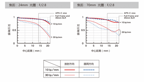 MTF(Modulation Transfer Function) 曲线图式表现所拍摄对象本身所持有的对比度在通过镜头再现时的真实程度的图表。MTF曲线图中的10本/mm(低周波)的曲线越接近1说明镜头的再现性、通透性就越好。而30本/mm(高周波)曲线越接近于1,则表示镜头的解像性越敏锐。随着画面的放射方向(实线)和圆周方向(虚线)的走向,弧线弯曲也会出现差别。而为了获得解像敏锐、使画面整体效果出色的优越性能,取得各曲线之间的平衡至关重要。由于虚化效果以及各种像差等原因,镜头的某些性能并无法完全通过曲线图来展现,因此MTF仅作为表示镜头性能尺度的一种,供您参考。