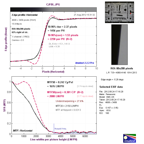 我们使用Imatest对本次评测所使用松下G5的分辨率与色散情况进行了测试,大家可以将测试所得的分辨率结果与上图标准进行比对,从而获得直观而明确的参考。
