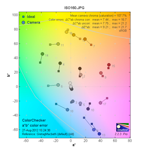 从ISO 160时的色彩偏移的情况看,松下G5的色彩饱和度为107.7%,最大偏移量为16.7。红色区域的偏移较大,其它色彩虽有偏移但都不大。说明松下G5在拍摄夕阳时,会带给我们意想不到的效果。