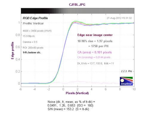 从边缘水平分辨率测试的结果看,分辨率达到了1515LW/PH,达到一般的水平,机内进行了一定的锐化,出现了驼峰现象。
