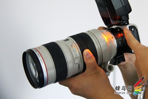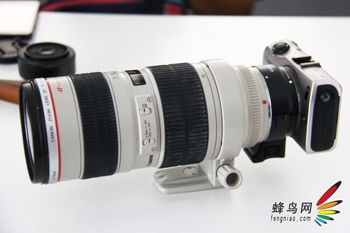 为了检验转接环的强度,并体验一下EOS M机身接EF镜头的手感,笔者在现场用一支EF 70-200与EF-EOS M进行了转接。
