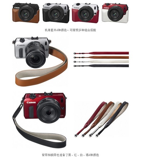 针对不同用户,佳能为EOS M机配备了4种颜色机身套,同时也开发了4种颜色的背带与腕带。