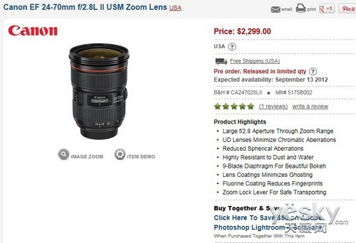 早在2012年的2月7日,佳能公司便发布了新一代标王镜头“佳能EF 24-70mm f/2.8L II USM”,并且预计在今年的4月份便可上市发售。但是我们从4月份等到了7月份,又从7月份等到了9月份,最终经历了多次延期后,佳能公司公开宣布“佳能EF 24-70mm f/2.8L II USM”在日本的上市时间为9月6日,欧洲和北美的上市时间是9月13日。目前在B&H Photo等网上商店已经可以预定佳能EF 24-70mm f/2.8L II USM,预售价2,299美元(约合人民币14,597元)。不过对方称9月只有少量商品供应,大量供应需要等到10月。