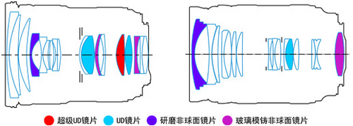 UD(Ultra Low Dispersion=超低色散)镜片主要的作用是为了减少色差,是代替造价昂贵的萤石镜片的一种等效廉价的镜片,两块UD镜片几乎能获得与一块萤石镜片相等的高性能光学特性。而超级UD镜片则是在UD镜片的基础上进一步提高光学性能,并且一块超级UD镜片已经可以达到和一块萤石镜片一样的效果。